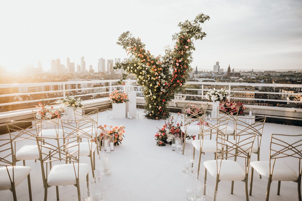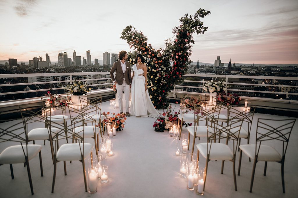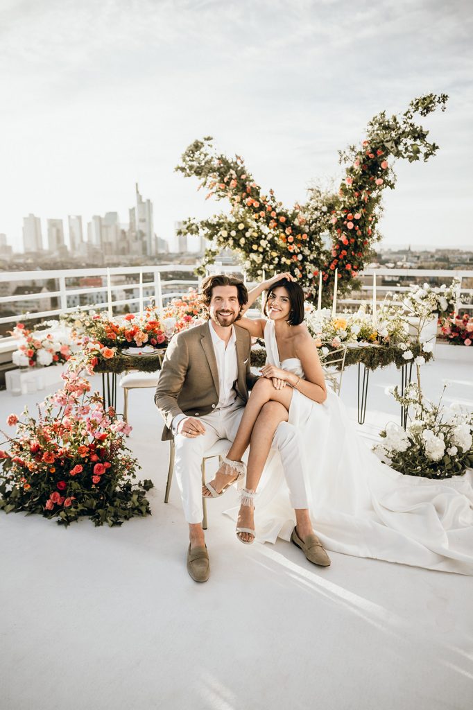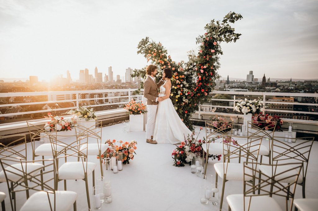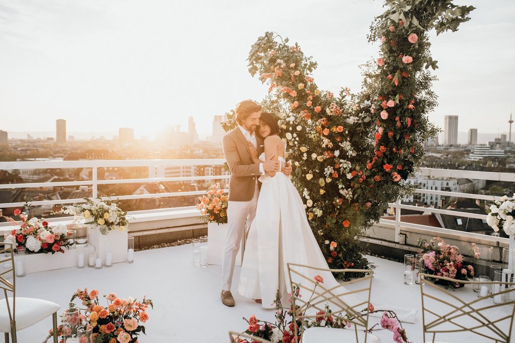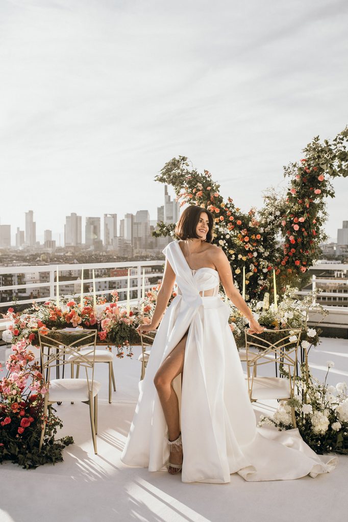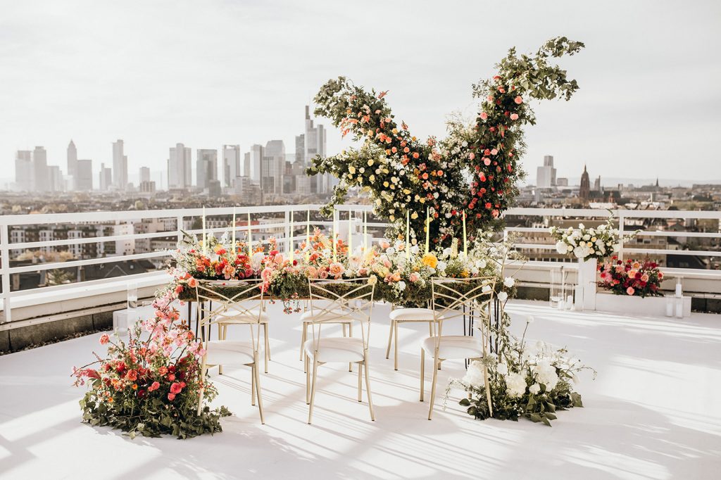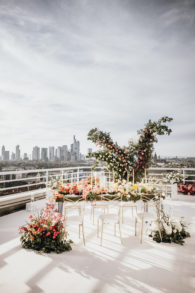 Ziel dieses Inspirationsshootings war es, den Glamour der Metropole Frankfurt im New York-Style aufleben zu lassen und die beiden Elemente Moderne und Opulenz zu vereinen, was besonders am Stil des Brautkleids sowie der Floristik zu erkennen ist. Ebenso wie die Stadt selbst, sollte der gesamte Blumenschmuck in Textur und Farben vereinnahmend sein und als Highlight in voller Pracht erstrahlen. Klare Linien auf der einen Seite und opulente Floristik auf der anderen, gepaart mit dezenten Goldtönen, welche auf leuchtende Sommerfarben von Gelb über Tangerine bis Pink treffen. Diesem wunderbaren Schauspiel von Farben kann man sich nicht entziehen und man lässt sich förmlich treiben – ein grandioser Blick auf die Skyline, gekrönt von einem atemberaubenden Sonnenuntergang und einem funkelnden Lichtermeer. Diese luxuriöse und spektakuläre Kulisse ist ein Fest der Sinne, welches dazu einlädt, sich bis in die Morgenstunden zu vergnügen und gemeinsam das Leben zu zelebrieren.