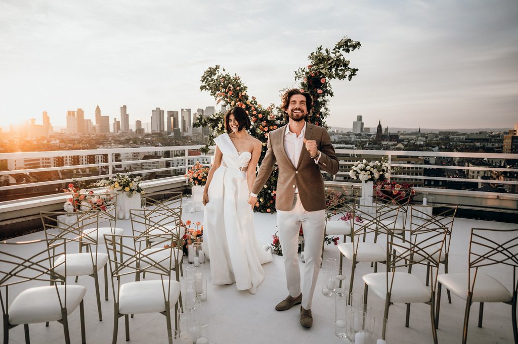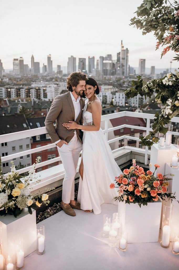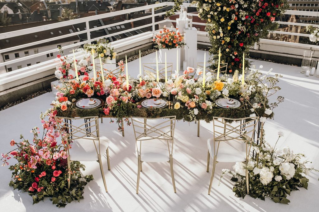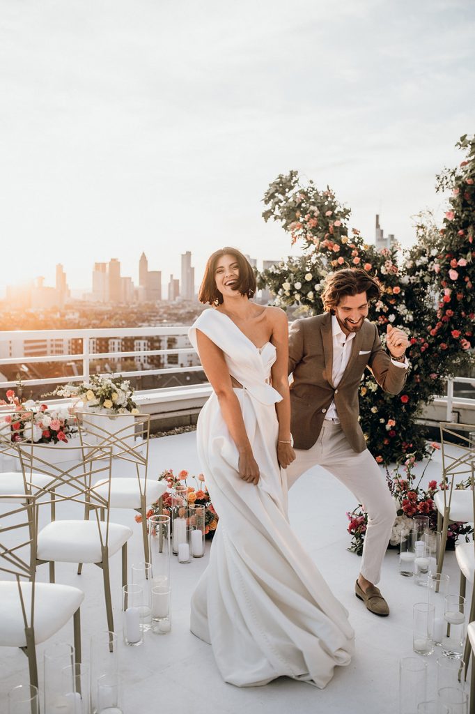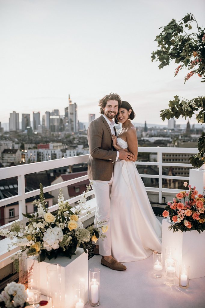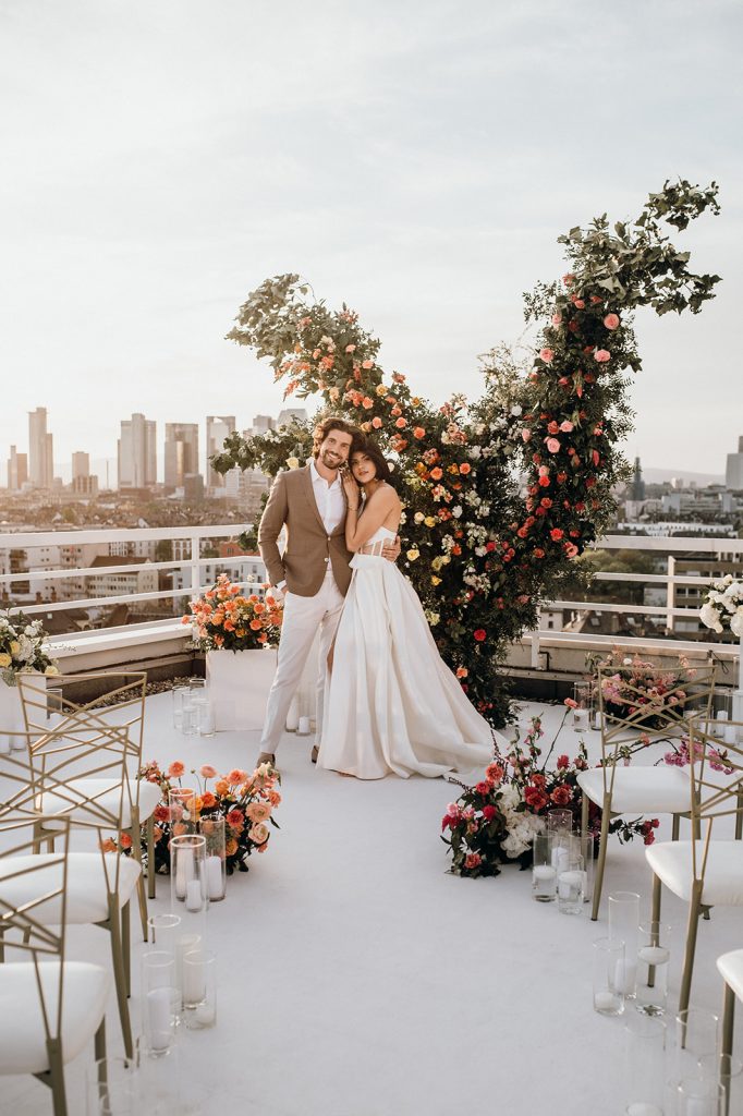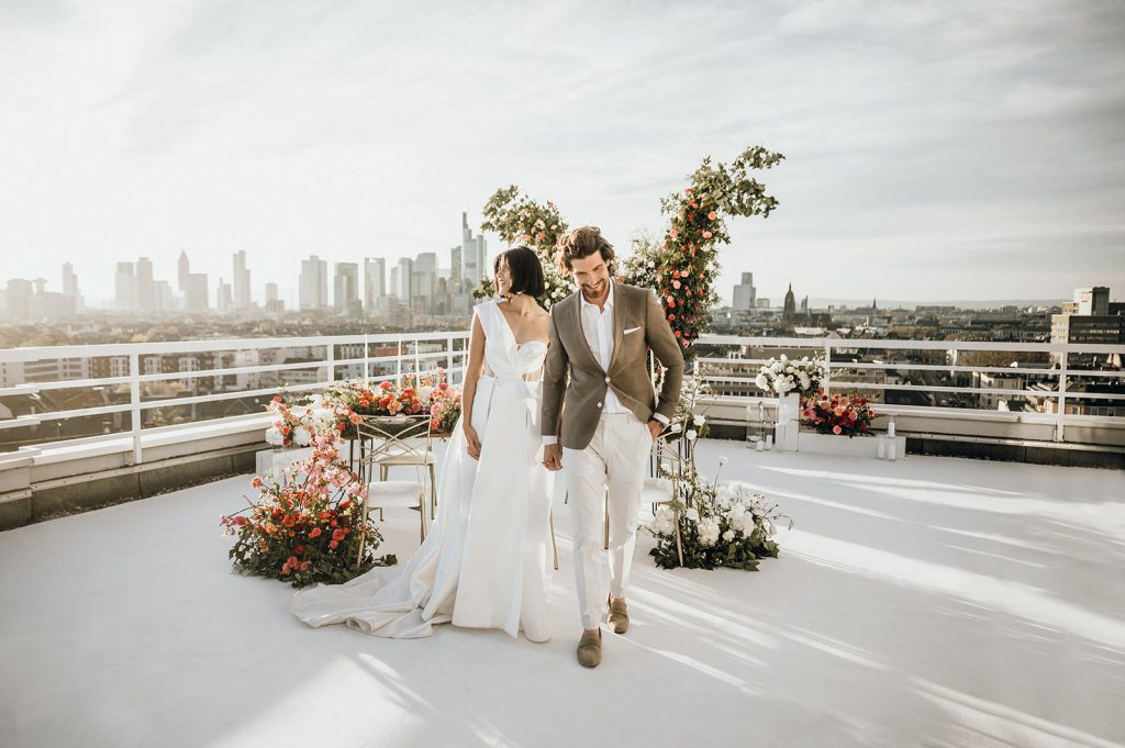 Ziel dieses Inspirationsshootings war es, den Glamour der Metropole Frankfurt im New York-Style aufleben zu lassen und die beiden Elemente Moderne und Opulenz zu vereinen, was besonders am Stil des Brautkleids sowie der Floristik zu erkennen ist. Ebenso wie die Stadt selbst, sollte der gesamte Blumenschmuck in Textur und Farben vereinnahmend sein und als Highlight in voller Pracht erstrahlen. Klare Linien auf der einen Seite und opulente Floristik auf der anderen, gepaart mit dezenten Goldtönen, welche auf leuchtende Sommerfarben von Gelb über Tangerine bis Pink treffen. Diesem wunderbaren Schauspiel von Farben kann man sich nicht entziehen und man lässt sich förmlich treiben – ein grandioser Blick auf die Skyline, gekrönt von einem atemberaubenden Sonnenuntergang und einem funkelnden Lichtermeer. Diese luxuriöse und spektakuläre Kulisse ist ein Fest der Sinne, welches dazu einlädt, sich bis in die Morgenstunden zu vergnügen und gemeinsam das Leben zu zelebrieren.
