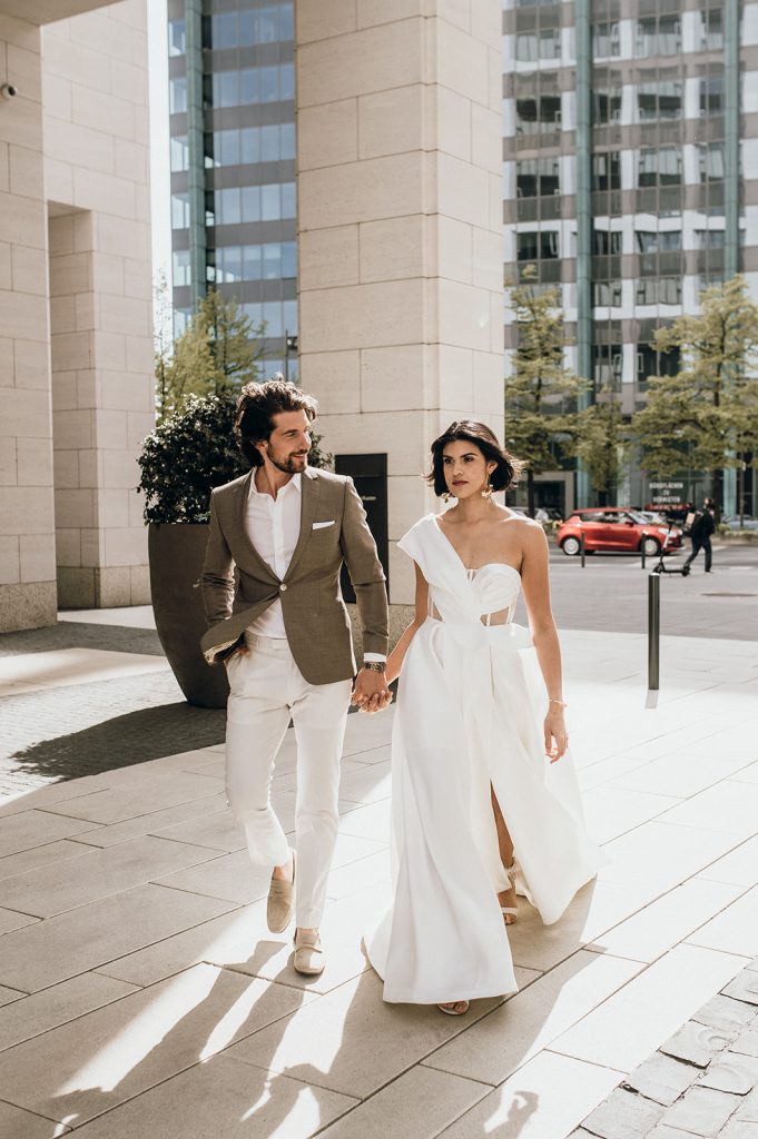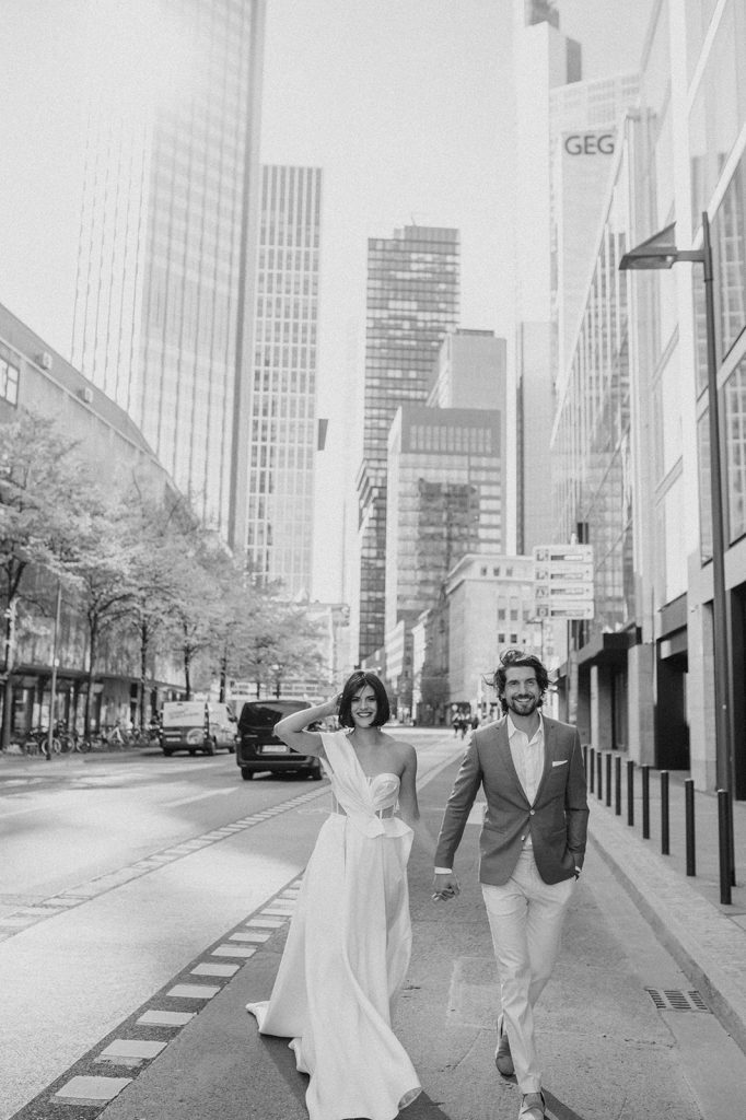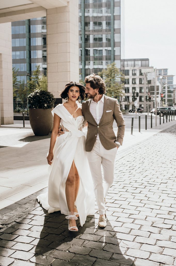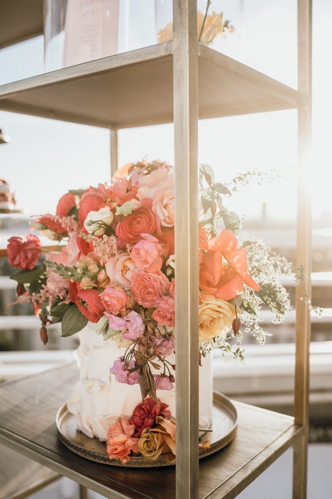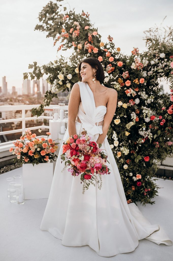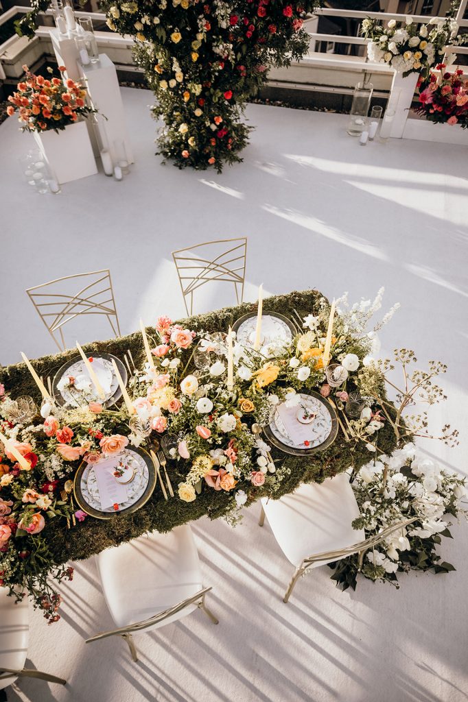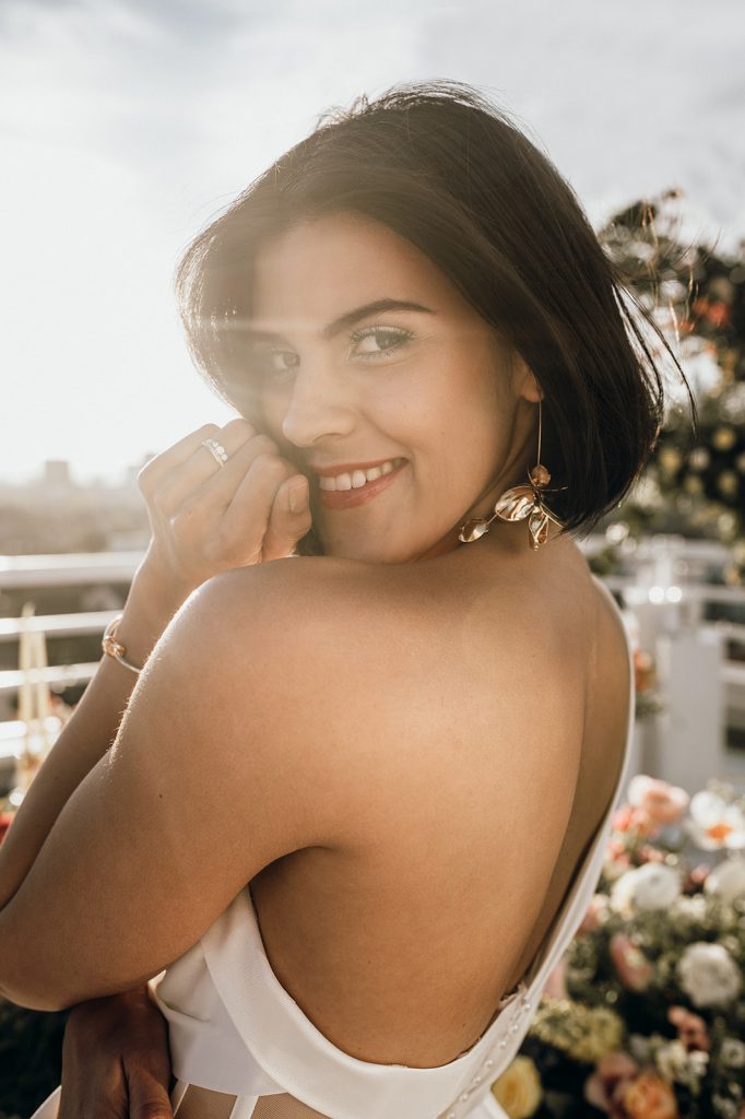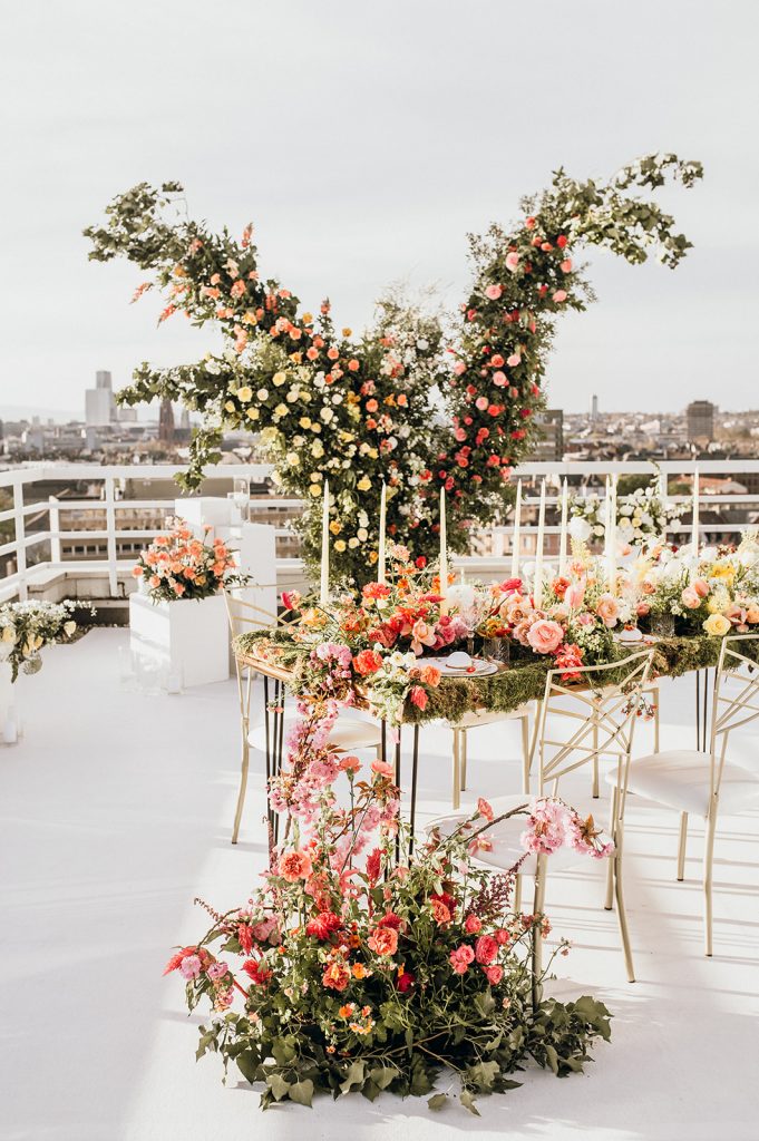 Ziel dieses Inspirationsshootings war es, den Glamour der Metropole Frankfurt im New York-Style aufleben zu lassen und die beiden Elemente Moderne und Opulenz zu vereinen, was besonders am Stil des Brautkleids sowie der Floristik zu erkennen ist. Ebenso wie die Stadt selbst, sollte der gesamte Blumenschmuck in Textur und Farben vereinnahmend sein und als Highlight in voller Pracht erstrahlen. Klare Linien auf der einen Seite und opulente Floristik auf der anderen, gepaart mit dezenten Goldtönen, welche auf leuchtende Sommerfarben von Gelb über Tangerine bis Pink treffen. Diesem wunderbaren Schauspiel von Farben kann man sich nicht entziehen und man lässt sich förmlich treiben – ein grandioser Blick auf die Skyline, gekrönt von einem atemberaubenden Sonnenuntergang und einem funkelnden Lichtermeer. Diese luxuriöse und spektakuläre Kulisse ist ein Fest der Sinne, welches dazu einlädt, sich bis in die Morgenstunden zu vergnügen und gemeinsam das Leben zu zelebrieren.