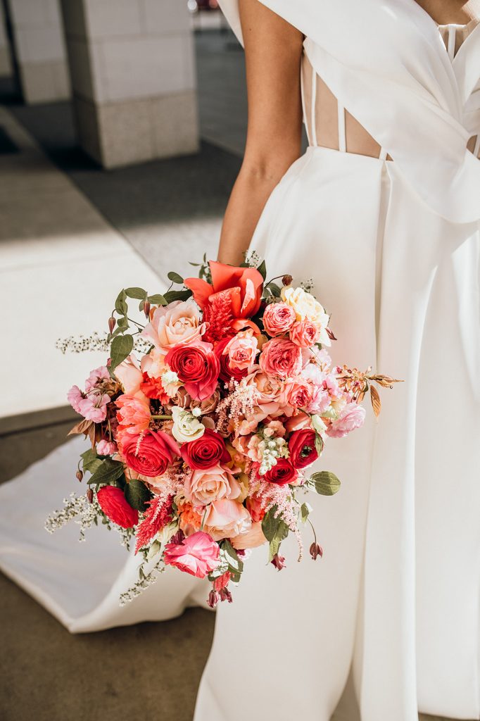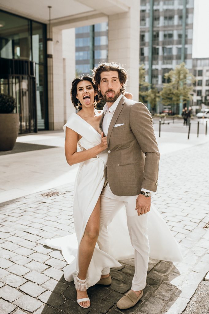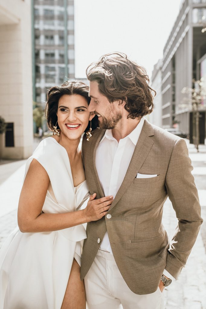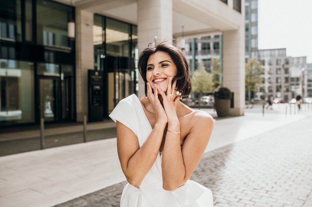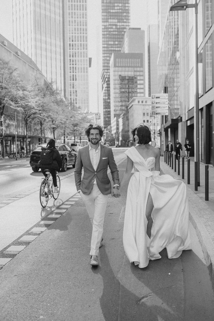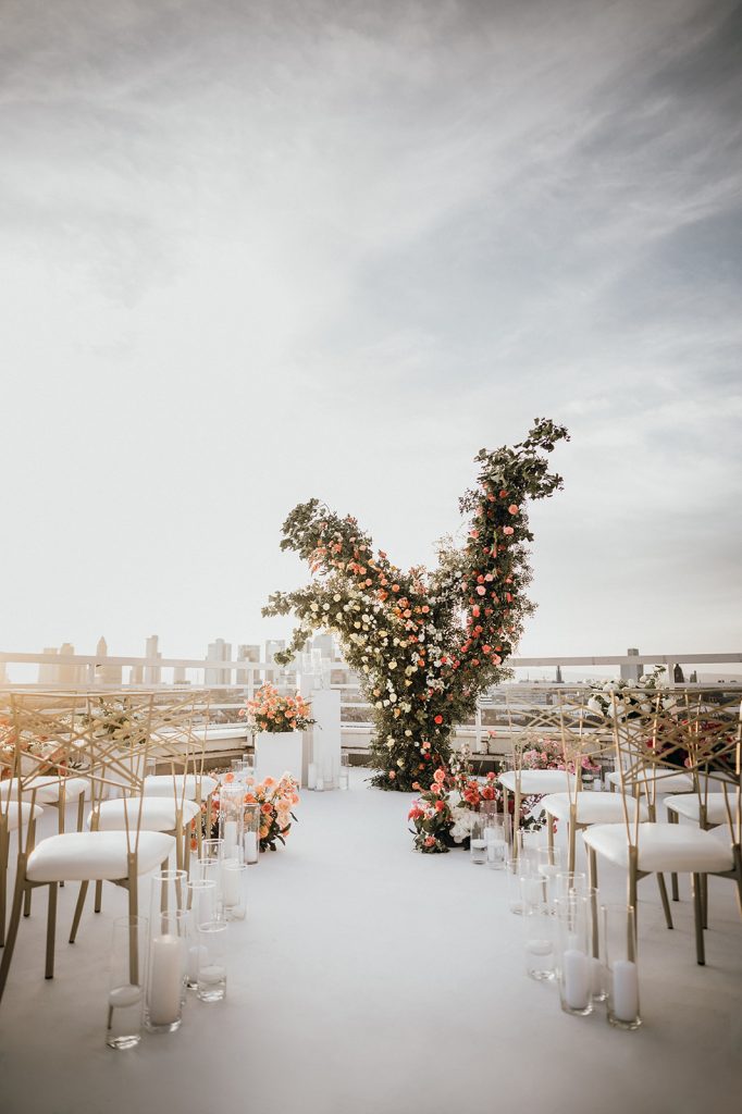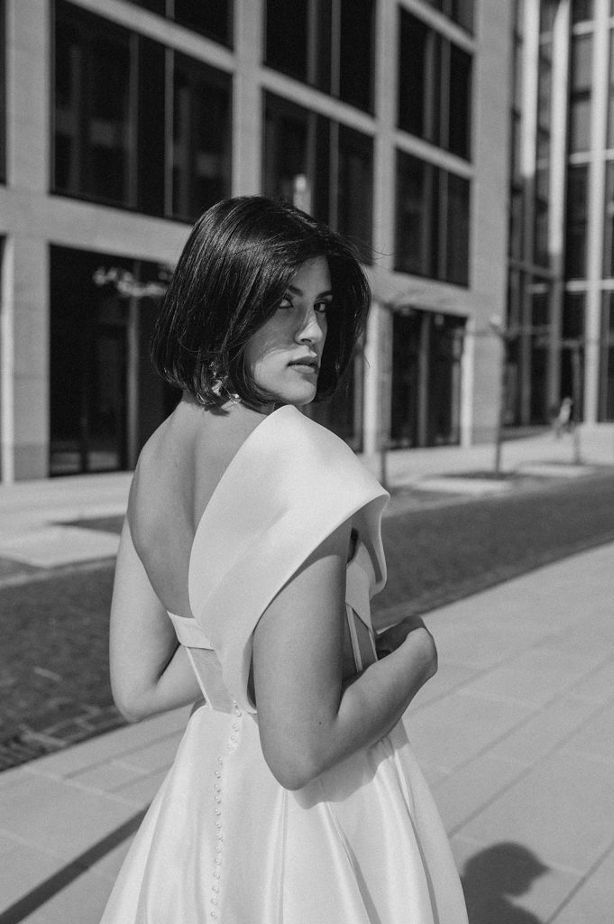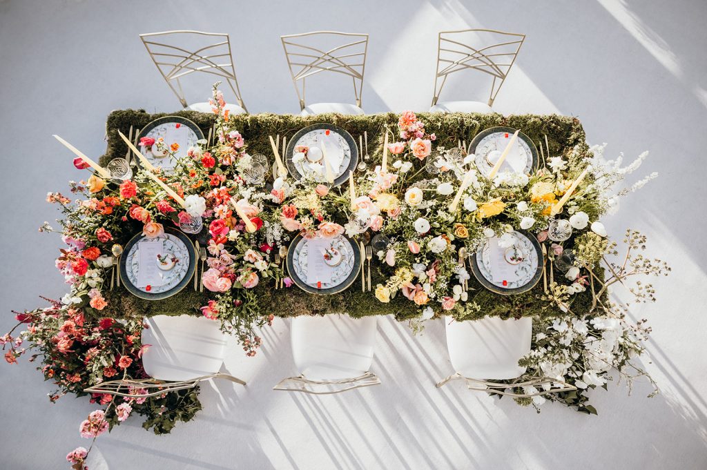 Ziel dieses Inspirationsshootings war es, den Glamour der Metropole Frankfurt im New York-Style aufleben zu lassen und die beiden Elemente Moderne und Opulenz zu vereinen, was besonders am Stil des Brautkleids sowie der Floristik zu erkennen ist. Ebenso wie die Stadt selbst, sollte der gesamte Blumenschmuck in Textur und Farben vereinnahmend sein und als Highlight in voller Pracht erstrahlen. Klare Linien auf der einen Seite und opulente Floristik auf der anderen, gepaart mit dezenten Goldtönen, welche auf leuchtende Sommerfarben von Gelb über Tangerine bis Pink treffen. Diesem wunderbaren Schauspiel von Farben kann man sich nicht entziehen und man lässt sich förmlich treiben – ein grandioser Blick auf die Skyline, gekrönt von einem atemberaubenden Sonnenuntergang und einem funkelnden Lichtermeer. Diese luxuriöse und spektakuläre Kulisse ist ein Fest der Sinne, welches dazu einlädt, sich bis in die Morgenstunden zu vergnügen und gemeinsam das Leben zu zelebrieren.