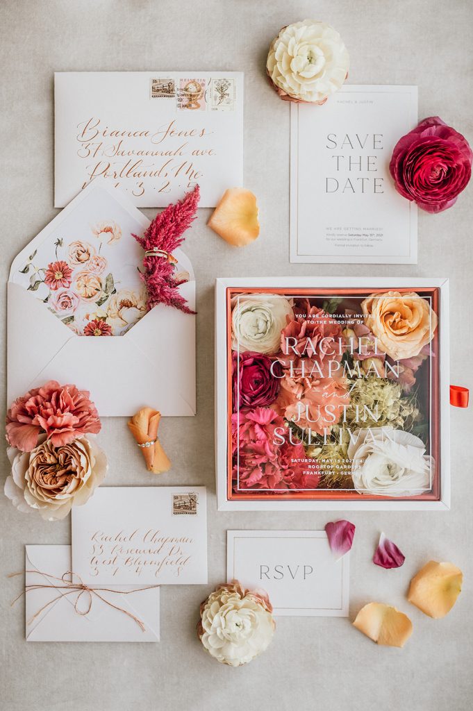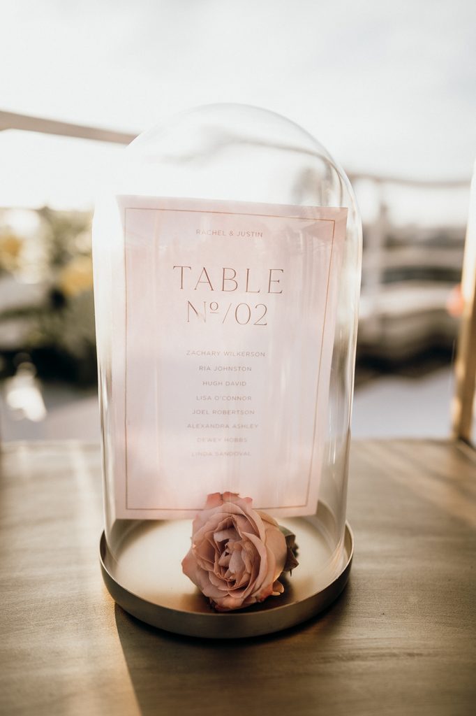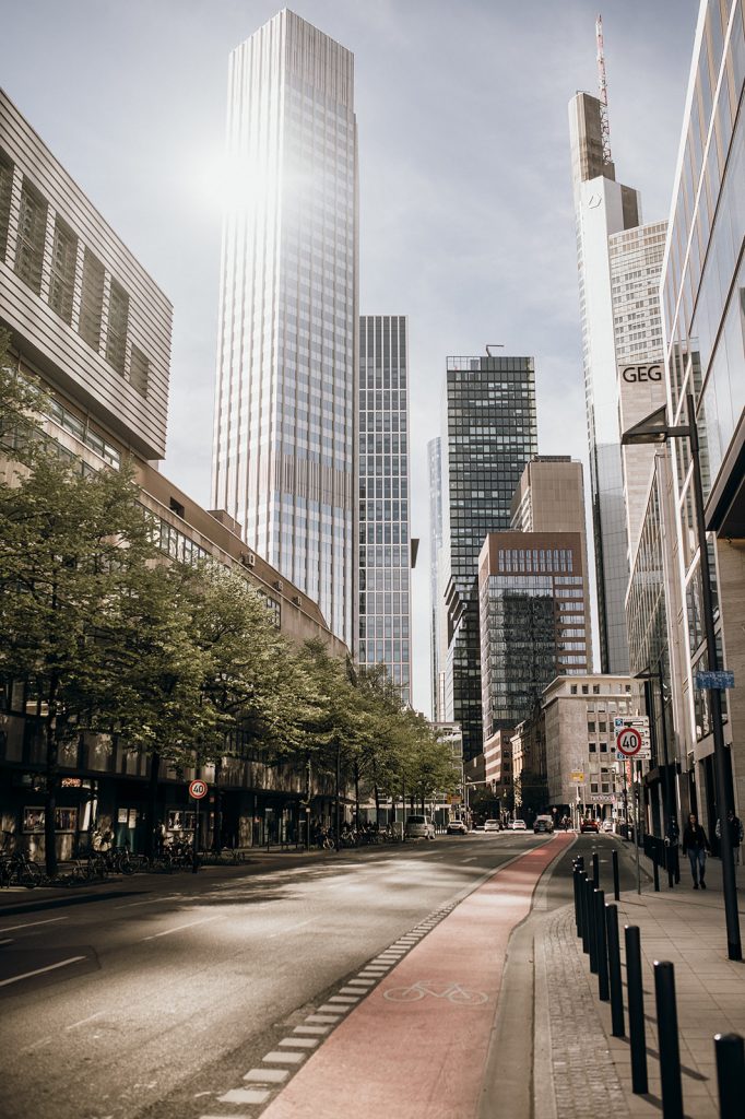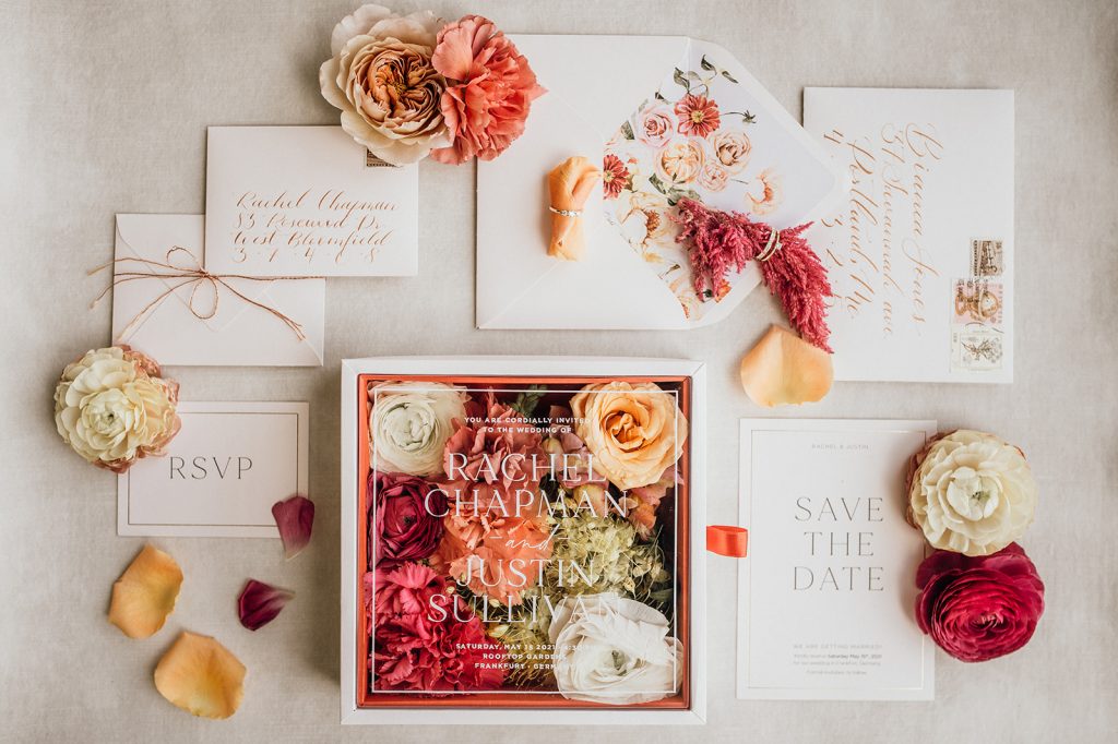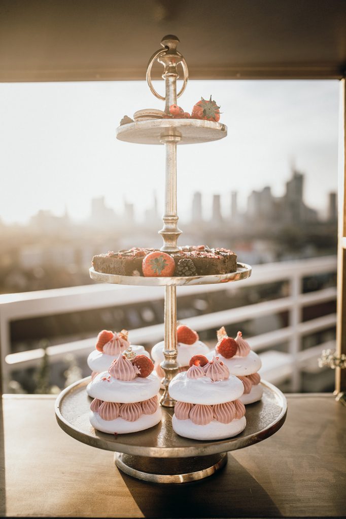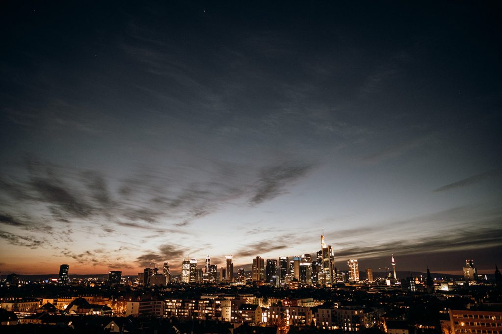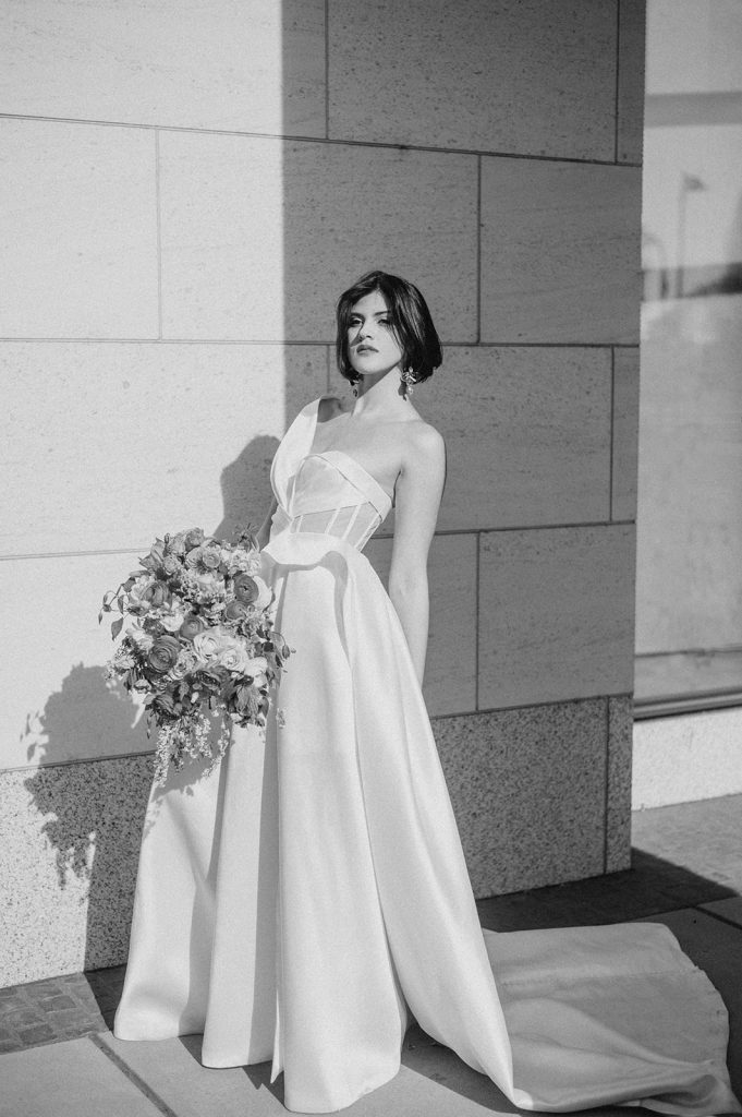 Ziel dieses Inspirationsshootings war es, den Glamour der Metropole Frankfurt im New York-Style aufleben zu lassen und die beiden Elemente Moderne und Opulenz zu vereinen, was besonders am Stil des Brautkleids sowie der Floristik zu erkennen ist. Ebenso wie die Stadt selbst, sollte der gesamte Blumenschmuck in Textur und Farben vereinnahmend sein und als Highlight in voller Pracht erstrahlen. Klare Linien auf der einen Seite und opulente Floristik auf der anderen, gepaart mit dezenten Goldtönen, welche auf leuchtende Sommerfarben von Gelb über Tangerine bis Pink treffen. Diesem wunderbaren Schauspiel von Farben kann man sich nicht entziehen und man lässt sich förmlich treiben – ein grandioser Blick auf die Skyline, gekrönt von einem atemberaubenden Sonnenuntergang und einem funkelnden Lichtermeer. Diese luxuriöse und spektakuläre Kulisse ist ein Fest der Sinne, welches dazu einlädt, sich bis in die Morgenstunden zu vergnügen und gemeinsam das Leben zu zelebrieren.