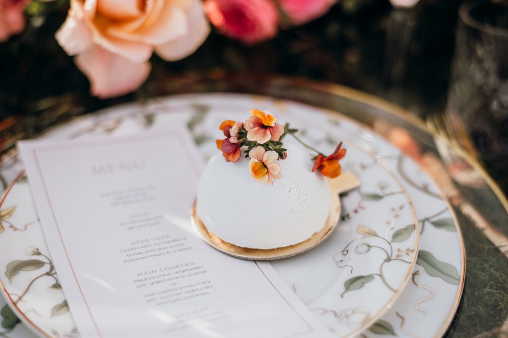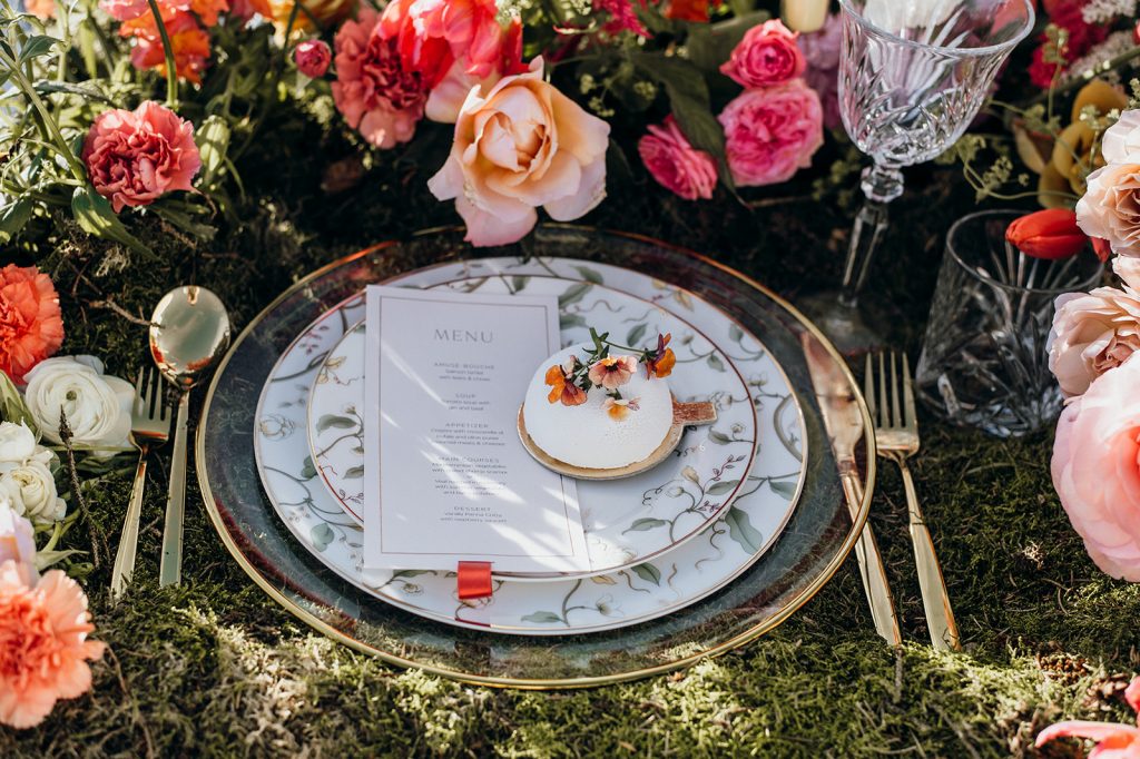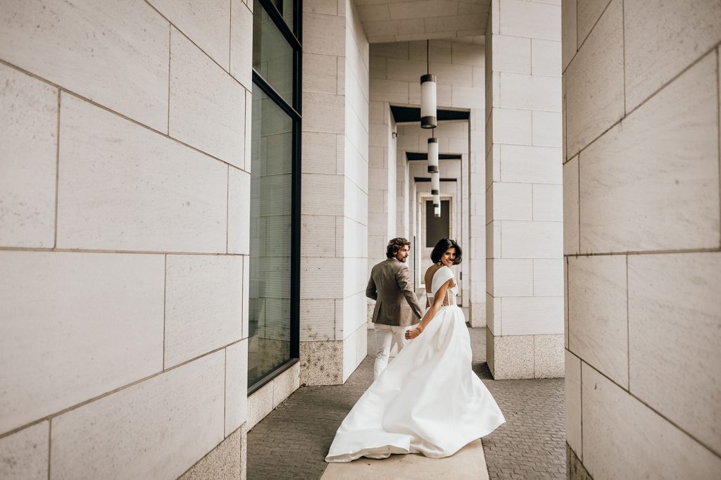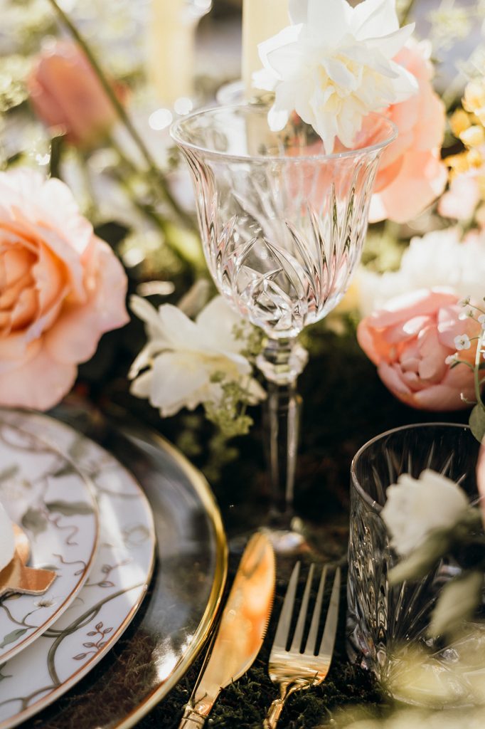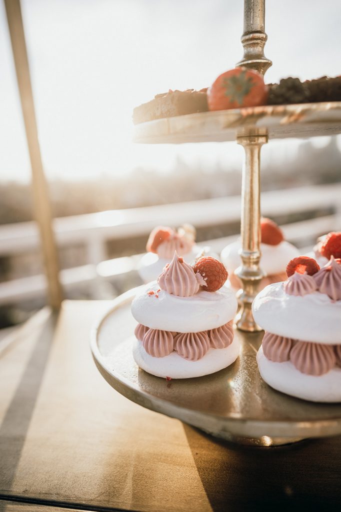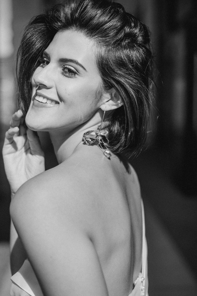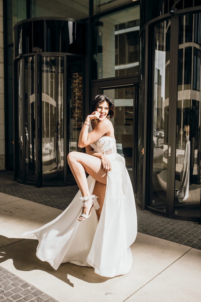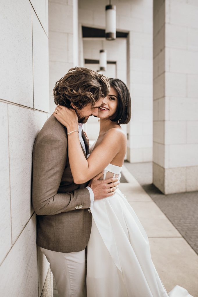 Ziel dieses Inspirationsshootings war es, den Glamour der Metropole Frankfurt im New York-Style aufleben zu lassen und die beiden Elemente Moderne und Opulenz zu vereinen, was besonders am Stil des Brautkleids sowie der Floristik zu erkennen ist. Ebenso wie die Stadt selbst, sollte der gesamte Blumenschmuck in Textur und Farben vereinnahmend sein und als Highlight in voller Pracht erstrahlen. Klare Linien auf der einen Seite und opulente Floristik auf der anderen, gepaart mit dezenten Goldtönen, welche auf leuchtende Sommerfarben von Gelb über Tangerine bis Pink treffen. Diesem wunderbaren Schauspiel von Farben kann man sich nicht entziehen und man lässt sich förmlich treiben – ein grandioser Blick auf die Skyline, gekrönt von einem atemberaubenden Sonnenuntergang und einem funkelnden Lichtermeer. Diese luxuriöse und spektakuläre Kulisse ist ein Fest der Sinne, welches dazu einlädt, sich bis in die Morgenstunden zu vergnügen und gemeinsam das Leben zu zelebrieren.